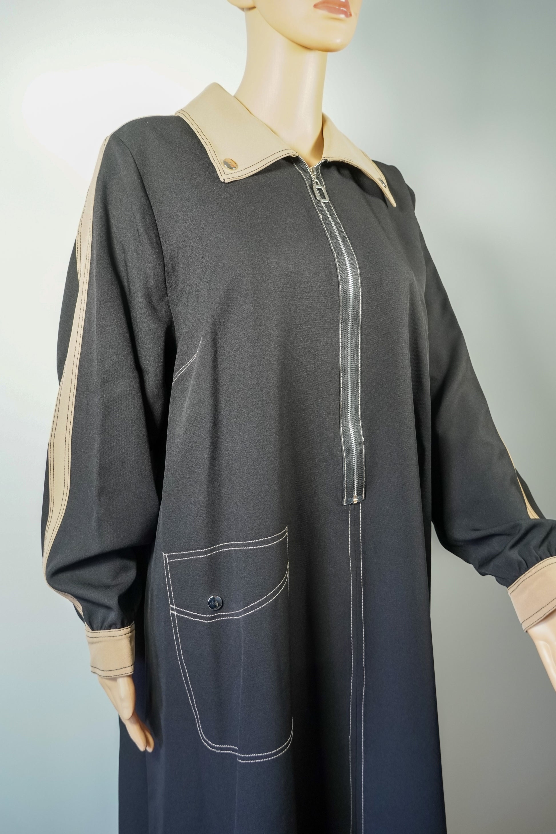 Robe longue noire à empiècements beiges et zip frontal